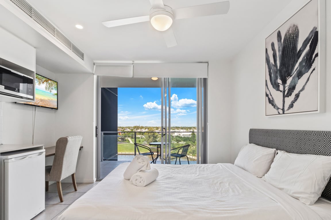Waterline at Oceanside offers the ideal stay for those looking to unwind in the heart of the Sunshine Coast, The thoughtfully designed studio, one, and two-bedroom apartments at Waterline offer a modern and tranquil space to relax– perfect for holidaymakers, professionals, or visitors to the Sunshine Coast. Each apartment features stylish interiors, a fully equipped kitchen or kitchenette, air-conditioning, complimentary WiFi, and a private balcony – all with beautiful views over Lake Kawana. Whether you're staying for a few nights or a few weeks, you'll feel right at home. Waterline at Oceanside is a non-smoking property. Property photographs are representative only, actual apartments occupied may vary in decor and inclusions from those shown.